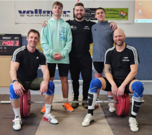 Team Schleusingen Gewichtheben beim Landesliga Finale 09.03.2024 v.l.n.r. 1. Reihe oben Robin Neumann, Johannes Kluge, William Kühnhold, Pascal Hennecke, Tom Reuter, 2. Reihe v.l.n.r. Silvio Hanft, Maik Heerlein, Saimen Panknin, Andy Pfeuffer, auf der Hantel v.l.n.r. Fabian Hennecke, Paul Kluge, Paul Skirde